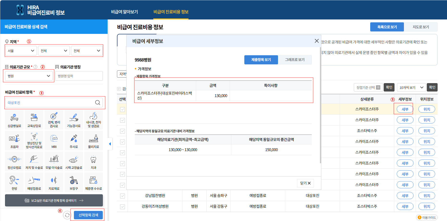 아래를 클릭하고 ①②③④⑤ 순서대로 조회하면 주변 병원에서 어떤 주사를 얼마에 접종하는지 알수 있고 평균 가격도 알 수가 있습니다.