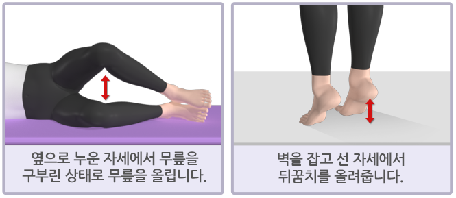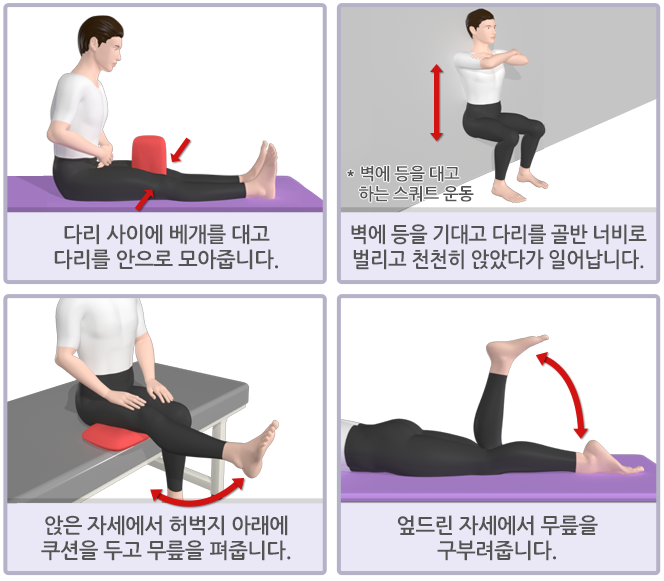 집안에서도 간단하게 할 수 있는 하체운동 소개해드리겠습니다. 무릎 주변 근력을 향상시켜 무릎 관절을 보호하고 외상으로 인한 손상을 예방할수 있습니다. 반대로 과도한 스쿼트와 런지운동, 힘든 등산, 장거리 조깅 등은 관절에 충격을 줄수 있기 때문에 피해야 합니다.