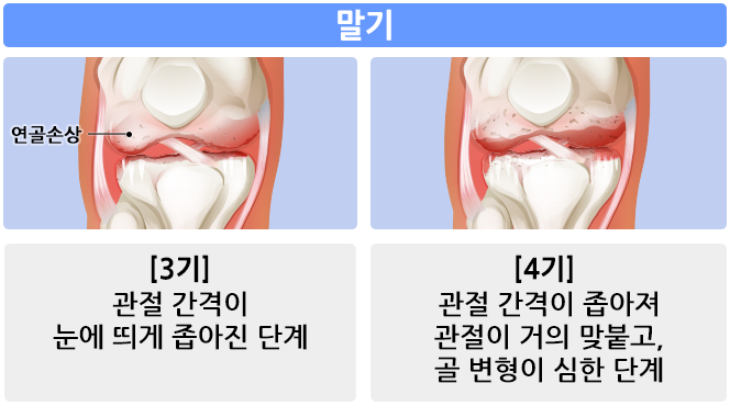 3기부터는 관절 간격이 아주 줄어들고 4기에는 거의 맞닿아 있는 상태가 됩니다. 골 변형도 심해지고 통증도 훨씬 자주, 쎄게 오며 가만히 있어도 아픈 상태가 됩니다. 약물치료나 주사치료로 보존적 치료를 우선 시도하겠지만 증상이 개선되지 않고 일상생활에 지장이 올 정도가 되면 수술적 치료를 고려해야 할 때가 옵니다.